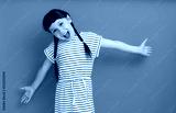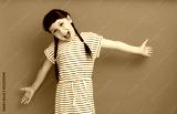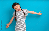 portrait of a cheerful child brunette girl enjoy rejoice win lottery sales raise the first cry