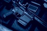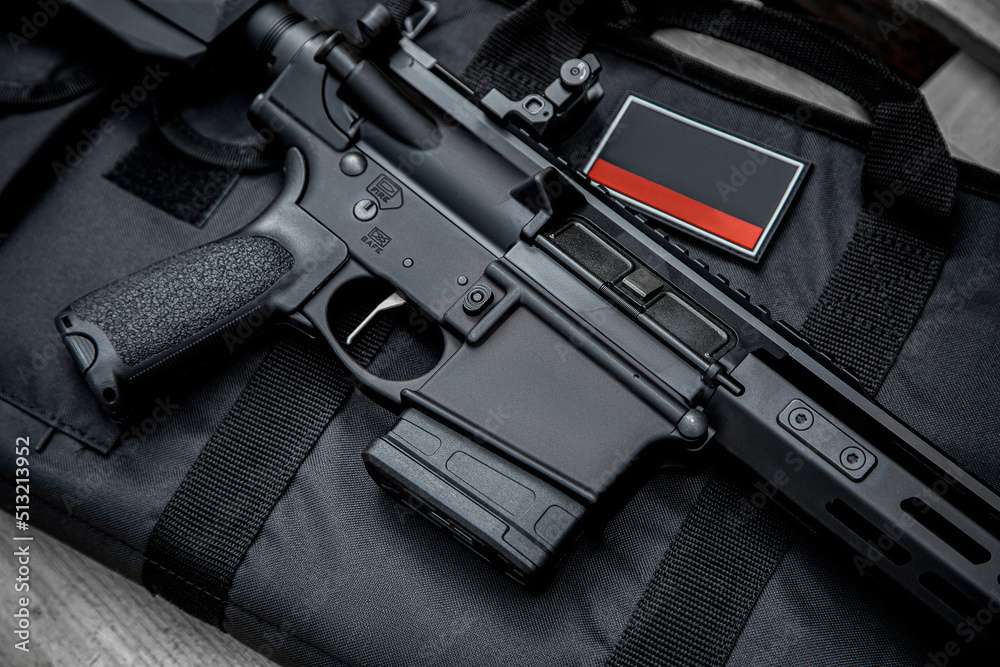 Modern carabiner and case for transportation and storage. Weapons for police, special forces and the army. Automatic carbine with mechanical sights.