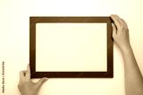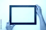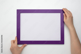 Holding frame mockup. Photo Mockup. Woman hands hold purple frame. For frames and posters design. Frame size A4. blank photo frame border with copy space in hands close up