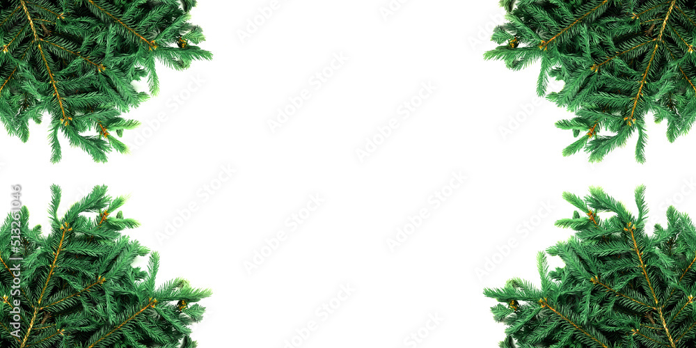 spruce branches isolated on white background arranged at corners of frame. template for greeting card for christmas or new year. christmas theme design elements