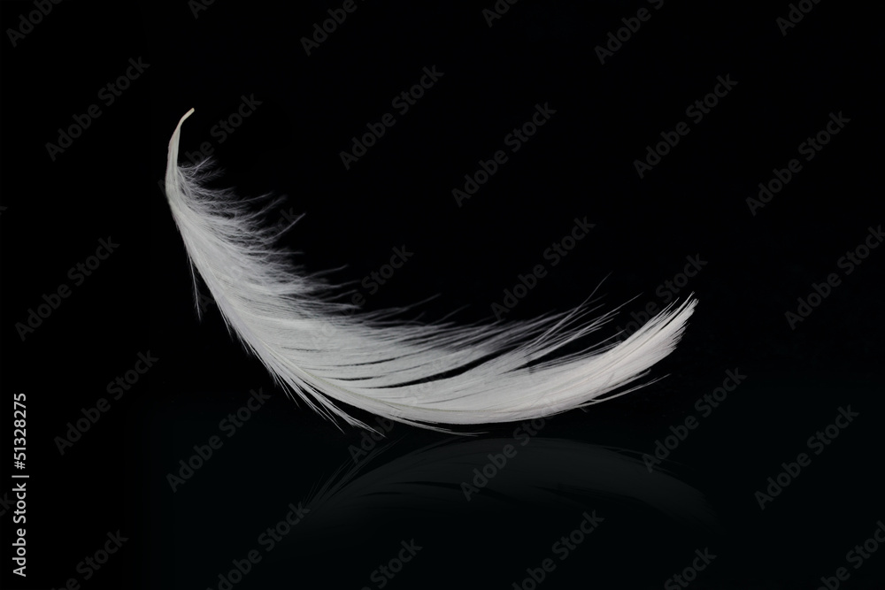 Flying white feather on black background