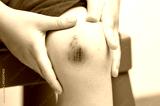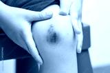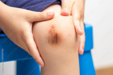 Closeup shot of a little boy sitting on the chair with a cut on his knee