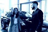 frustrated young woman in a car dealership screaming waving gesturing with hands