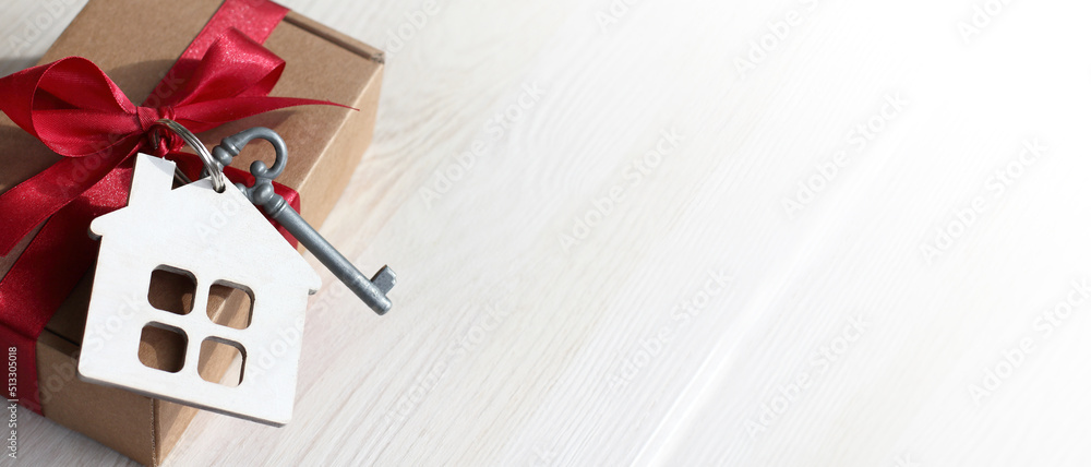 house and key on a box with a red bow. real estate offer gift concept