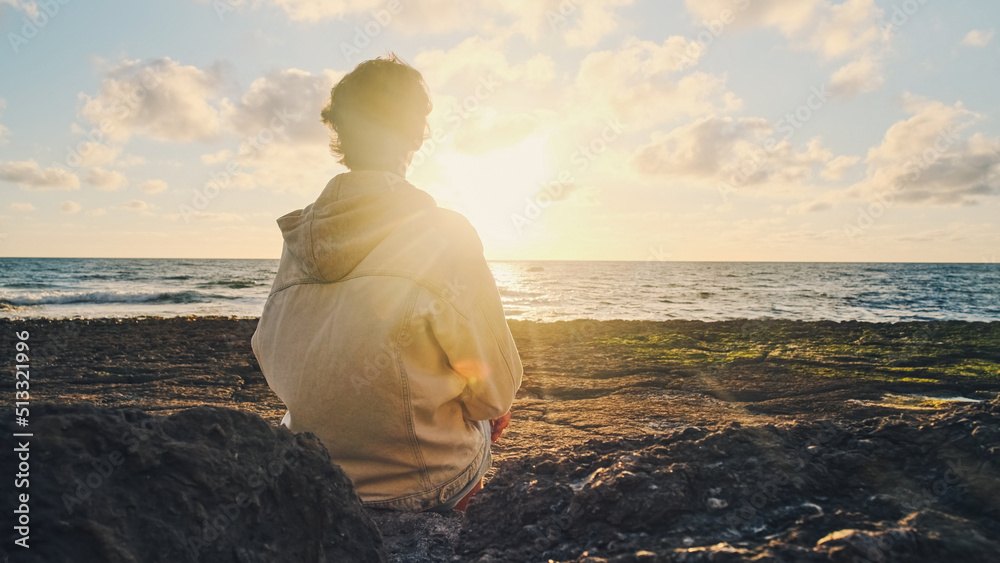 Man on a beach is looking distance during beautiful summer sunset. Human looks to the sun over horizon in the morning while sunrise. Happy person contemplates the beauty of nature. Freedom concept.