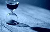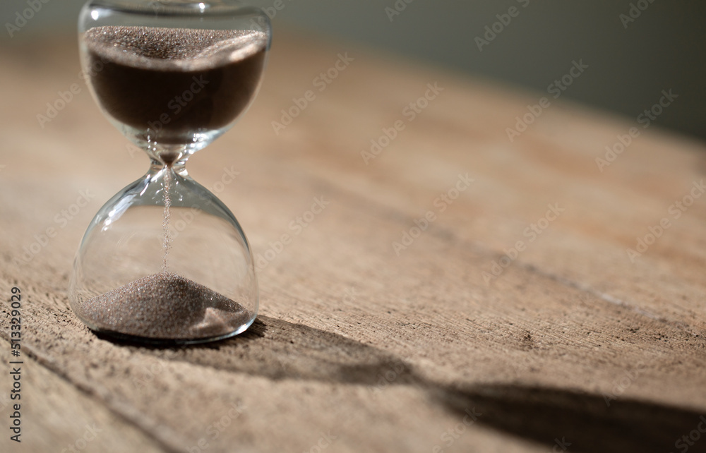 hourglass (sand clock) on an old wooden table, deadline for doing business, elapsed time concept, copy space.