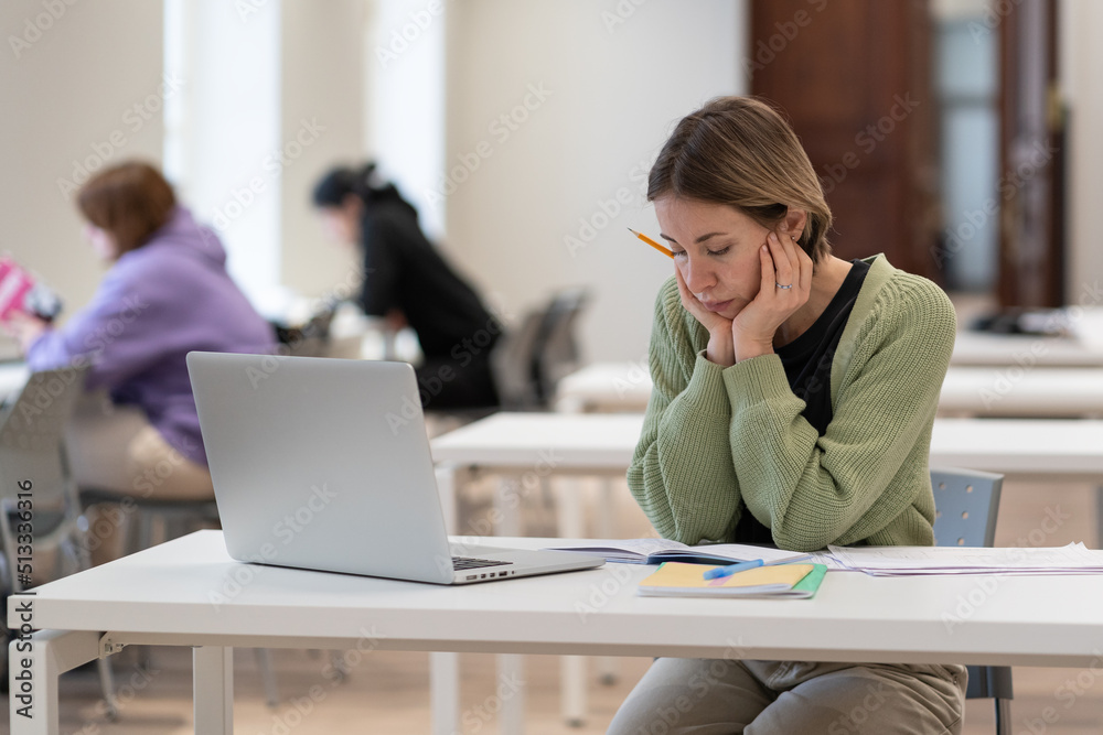 Upset female mature-age student sitting at desk with laptop in classroom, tired of studying. Pensive middle-aged 45s woman, adult learner working on difficult homework. Second degree in middle age