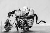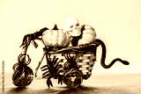 Composition of pumpkins, spiders and snakes with a human skull.