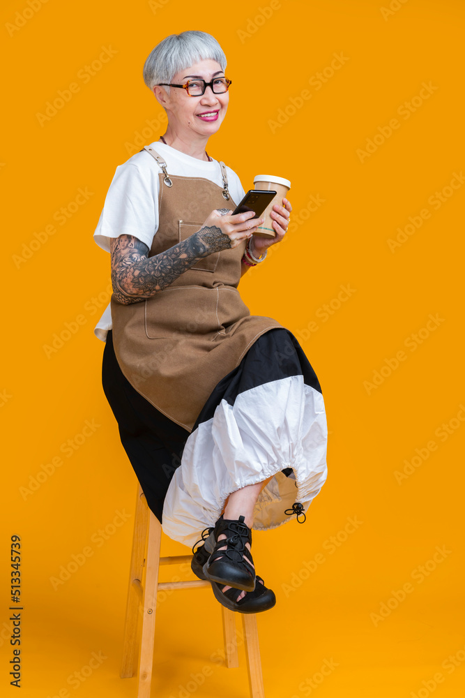 senior old female tattoo business owner wear apron hand hold coffee cup and smartphone portrait smile,online marketing for small business senior asian female receive order from online shop purchase