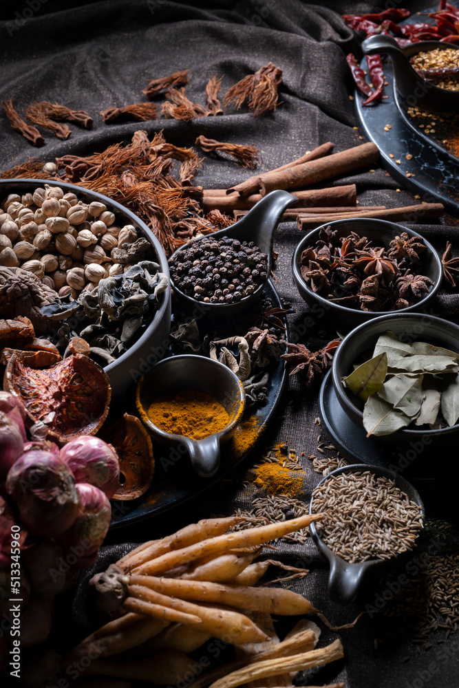 Various Thai and Chinese herbs in ceramic bowl on a dark background. Herbal and Spices Oriental marketplace.