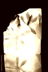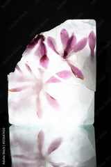 Beautiful flowers purple blooming magnolia in transparent ice block.
