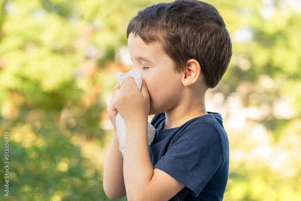 Allergic child sneezing covering nose with wipe in a park in spring or summer season