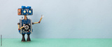 A kind smiling robot robot looks away from itself. Steampunk mechanical toy, technology robotic poster template with place for text and design. Light blue, green copy space