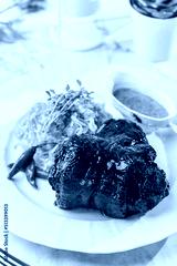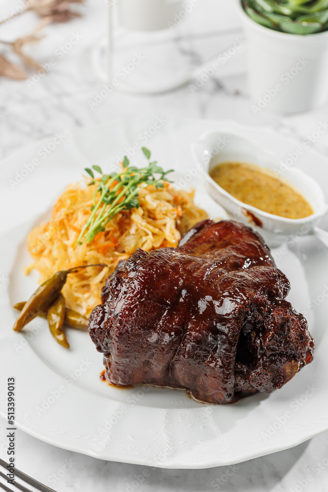 Tasty Baked Eisbein ( pork knuckle) , with salad and mustard at the white plate on light marble background. Healthy sea food, hard light, restaurant decor, close up