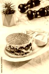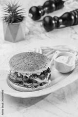 Tasty burger with french fries and sauce at the white plate on light marble background. Healthy sea food, hard light, restaurant decor, close up