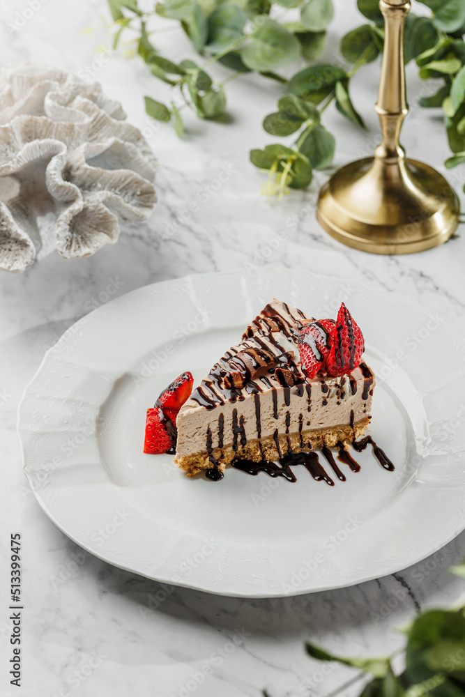Tasty cheesecake with fresh strawberry and chocolate, nuts in the white plate on light marble background. Healthy sea food, hard light, restaurant decor, close up