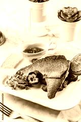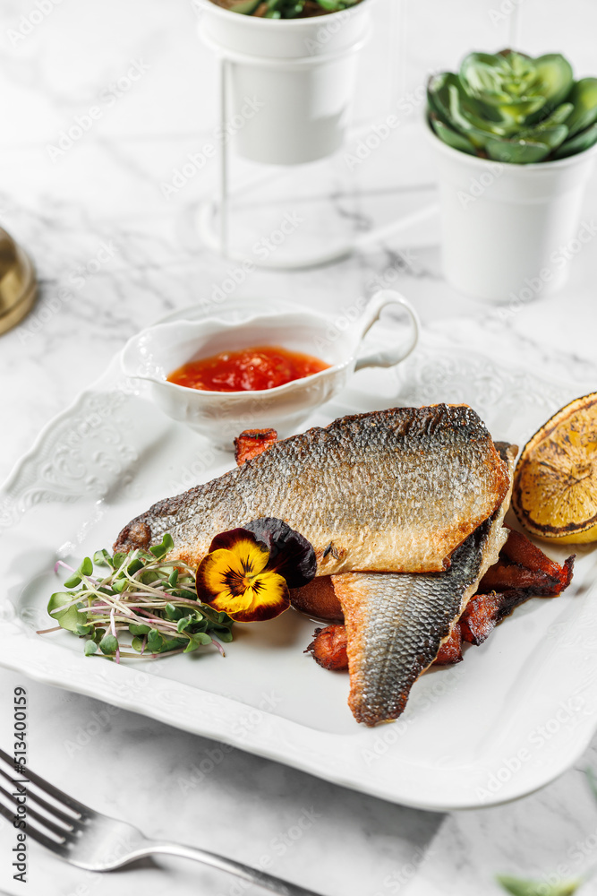 Baked Dorado fillet fish with sweet potato, lime and tomato sauce at the white plate on light marble background. Healthy sea food, hard light, restaurant decor