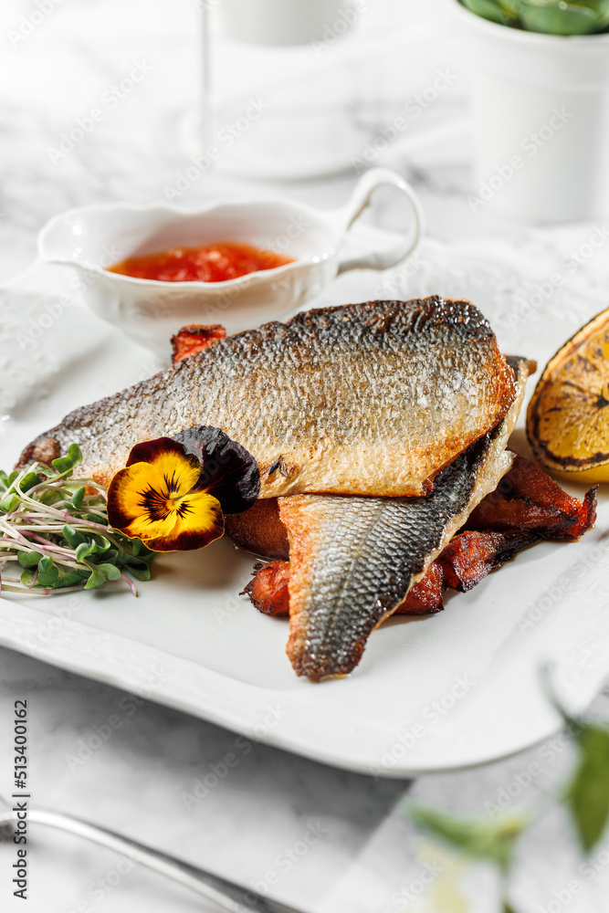Baked Dorado fillet fish with sweet potato, lime and tomato sauce at the white plate on light marble background. Healthy sea food, hard light, restaurant decor