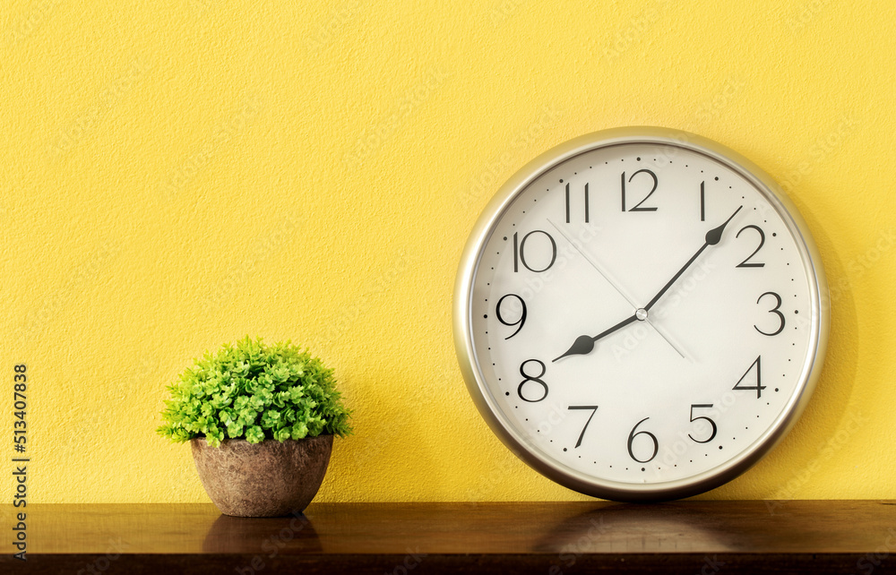 A clock on wooden table with flower pot over yellow background, 8 o'clock 7 minutes