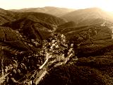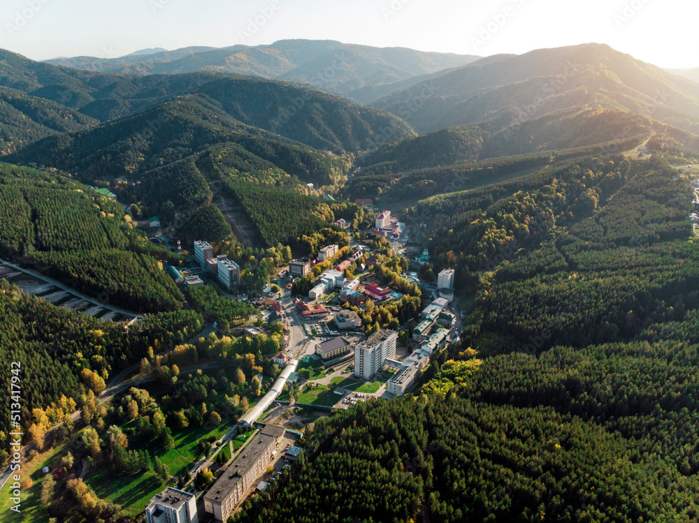 Aerial view of a small town in the Altai territory. Top view of the resort town Belokurikha. Bird's-eye view of the houses among the forests on the slopes of the mountains.