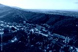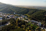 Aerial view of a small town in the Altai territory. Top view of the resort town Belokurikha. Bird's-eye view of the houses among the forests on the slopes of the mountains.