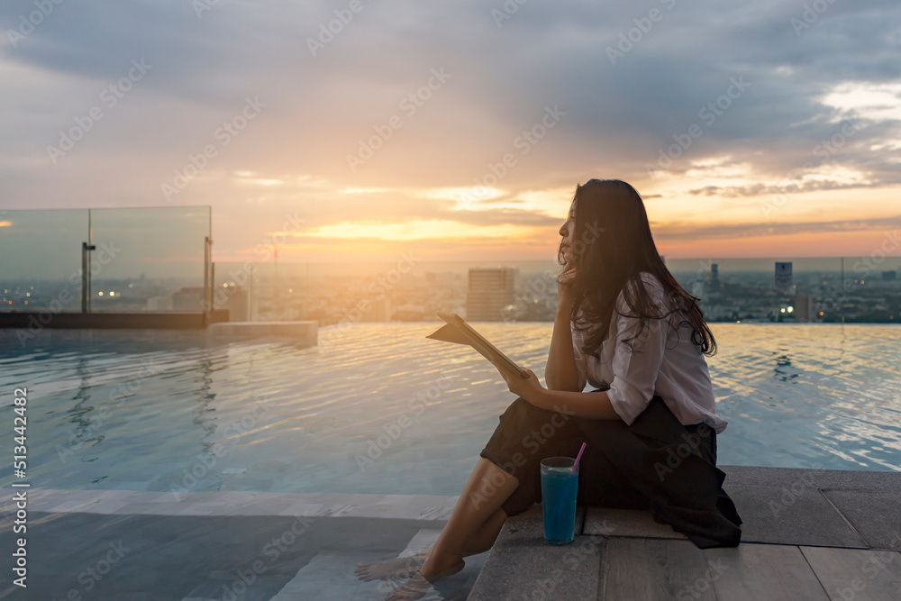 Freelancer asian woman resting after work with digital tablet outdoors at swimming pool with sunset and skyscraper view on Blurred background city, enjoy her holiday or break and enjoying cocktail.