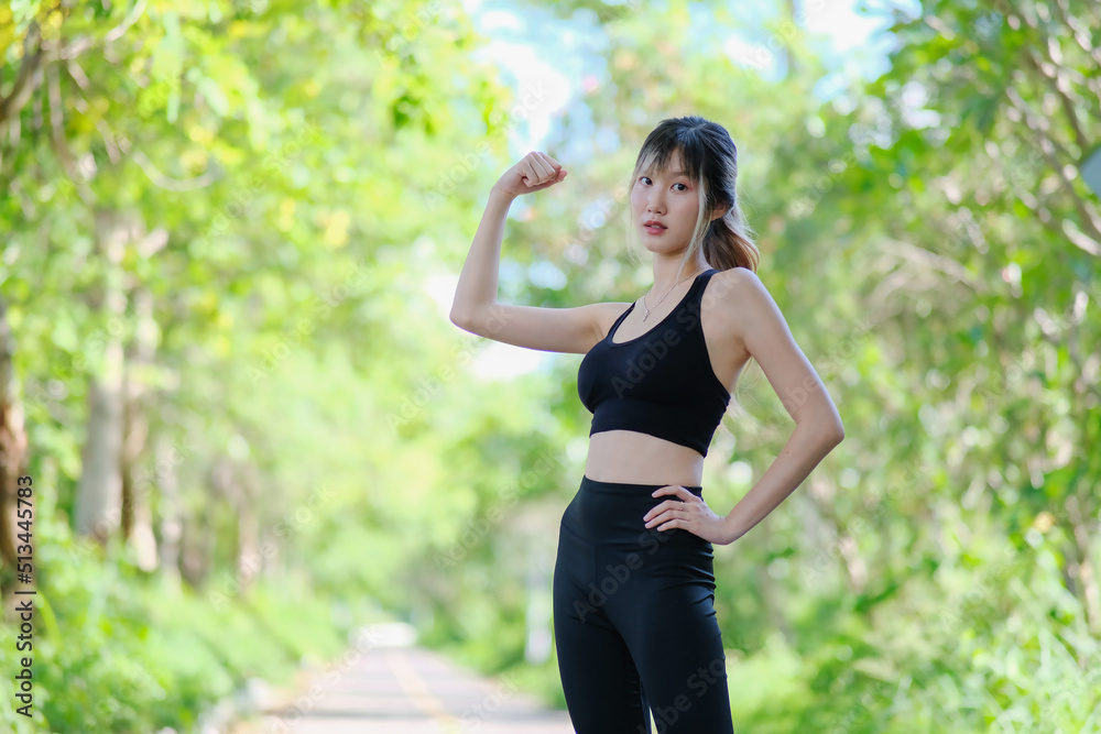 Young female athlete looks serious as she stretches before working out outside in the city. A young woman works out her muscles against a natural backdrop.