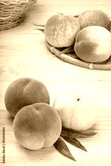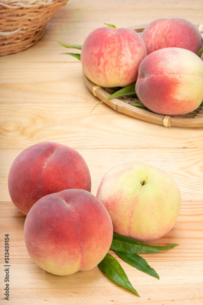 Pink and yellow Peach fruit with leaf on white background, Fresh Sweet Peach on wooden basket.