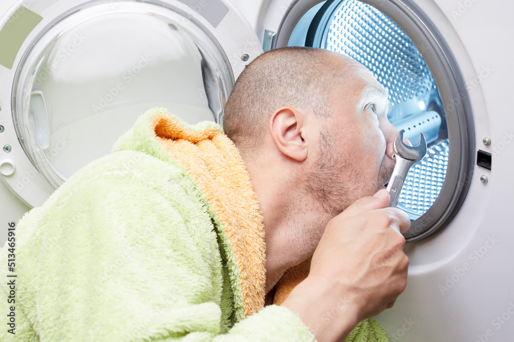 A bald caucasian man holding wrench and tried to fixed washing machine.