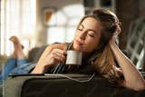 Young woman at home. Beautiful girl listening the music while drinking coffee