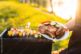 Crop chef with plate of grilled meat and vegetables