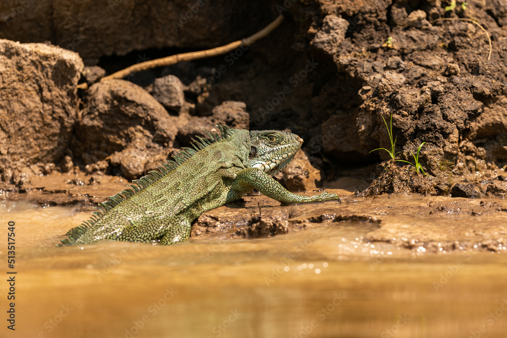 Wild green iguana close up in the nature habitat. Wild brasil, brasilian wildlife, pantanal, green jungle, iguana iguana.