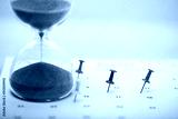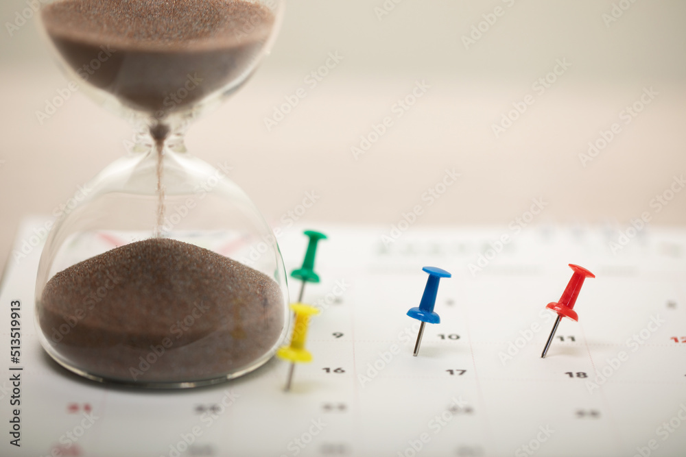 Pin and hourglass (sand clock) on the calendar, planning for a business meeting or travel planning concept, vacation, copy space