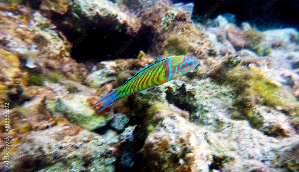 Green male ornate wrasse fish in Mediterranean sea - Thalassoma pavo