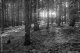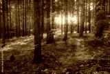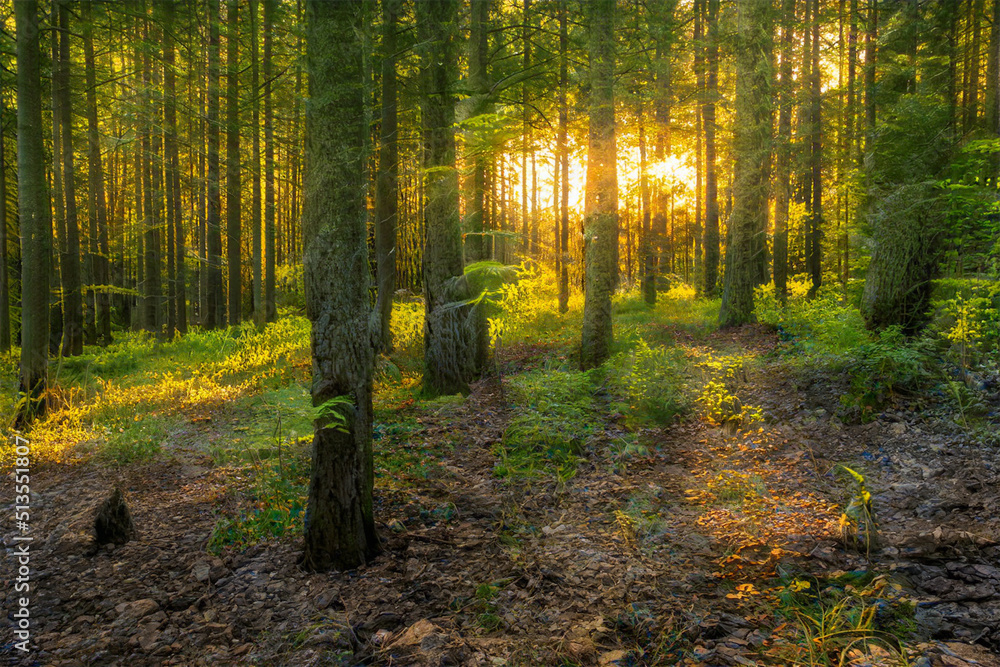 Magical sunset in the forest.