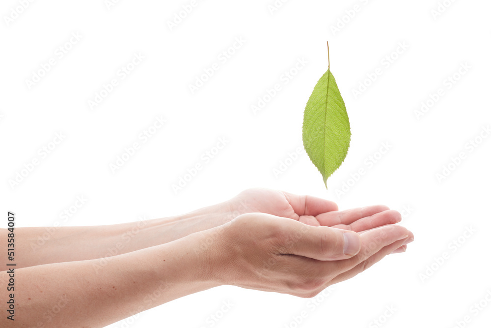 A male hand holds a leaf of cherry on a white background. Concept of protection nature on planet.