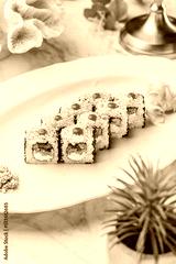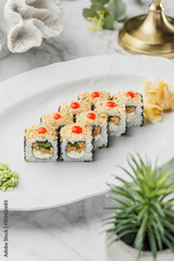 California sushi roll with eel, avocado and cucumber in the white plate on light marble background. Healthy sea food, hard light, restaurant decor,close up