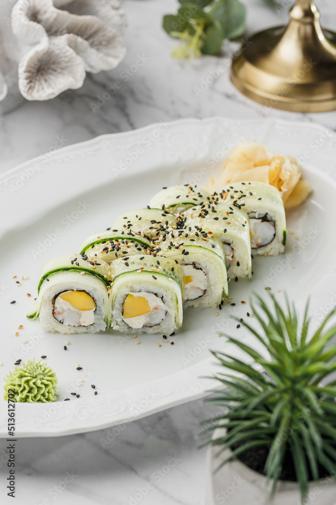 Sushi roll set with cucumber, avocado, cheese ,seasame and shrimps in the white plate on light marble background. Healthy sea food, hard light, restaurant decor,close up