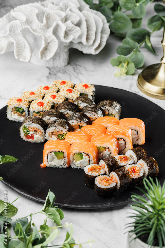 Fresh Sushi roll big set with philadelphia. Japanese seafood sushi at the black plate on light marble background. Healthy sea food, hard light, restaurant decor,close up