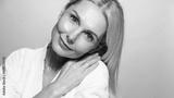 Skin care and rejuvenation. Beautiful mid 50s woman with perfect, clear glowing skin, natural aging wrinkles, posing in bathrobe over blue background