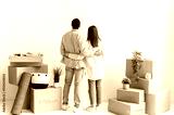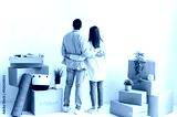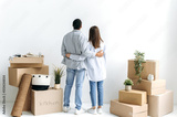 New housing, relocation. Happy young multiracial couple, are standing with their backs to the camera between boxes of stuff in their new home or rental apartment, planning their house future design
