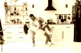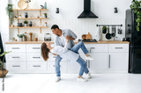 A young modern happy couple in love, newlyweds, stylishly dressed, dance together to their favorite music at home in the kitchen with stylish interior, smile, enjoying to spending time with each other