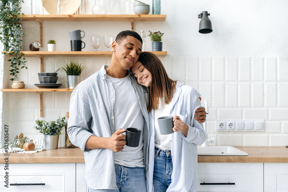 Joyful positive hispanic man and caucasian woman, happy couple in love, stand at home in the kitchen, hug, drink tea or coffee together, enjoy spending time with each other, smile