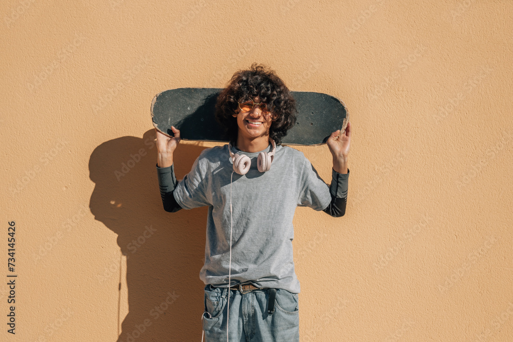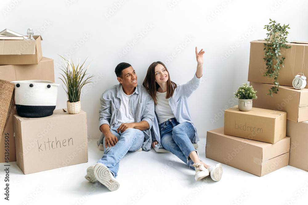 Happy young multiracial couple, caucasian woman and hispanic guy, are sitting on the floor between boxes of stuff in their new home or rental accommodation, planning their house future design, smile