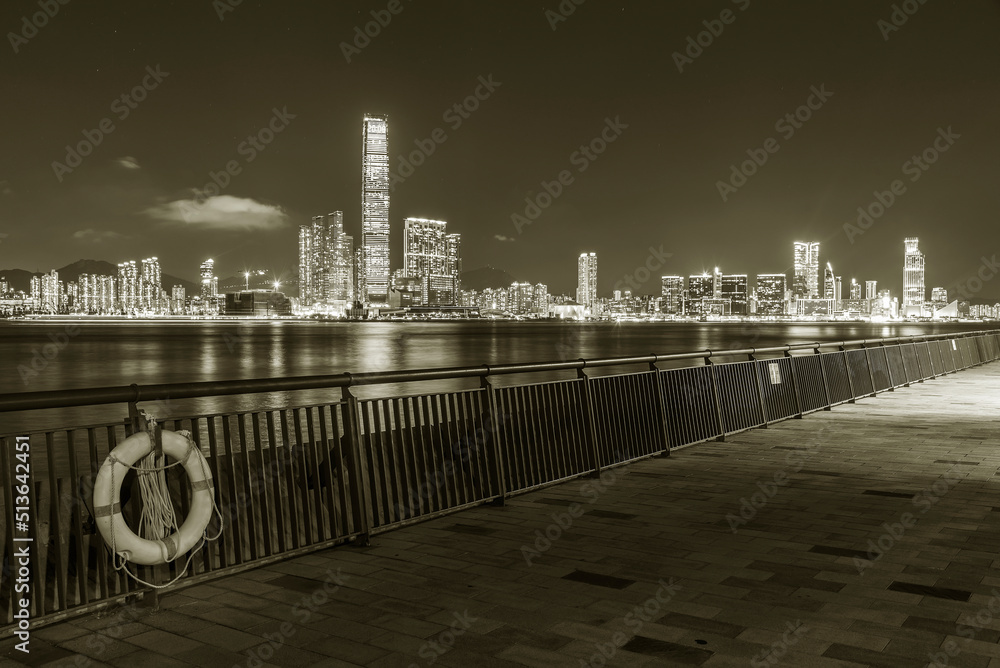 Night scenery of seaside promenade of Victoria harbor of Hong Kong city