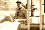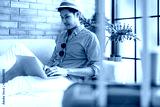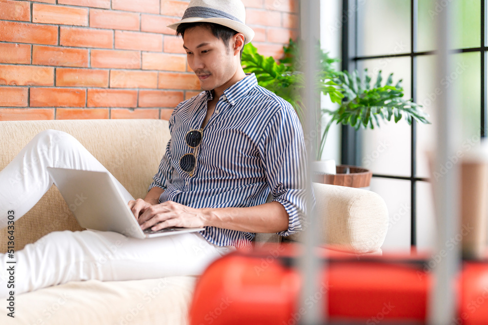 Asian male man digital nomad hand working with notebook laptop while waiting for flight schedule at hotel interior lobby,ready to travel asia man tourist smiling cheerful sit on sofa hotel lobby
