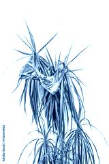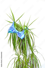 Blue women's swimsuit hanging on palm tree, the concept of summer holidays at sea