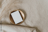 Flatlay of blank paper card on brass dish, pampas grass on neutral beige crumpled linen cloth. Business template. Top view, flat lay minimalist aesthetic luxury bohemian business branding concept