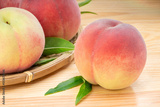 Pink and yellow Peach fruit with leaf on white background, Fresh Sweet Peach on wooden basket.