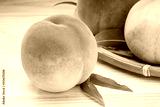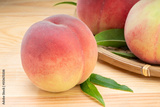 Pink and yellow Peach fruit with leaf on white background, Fresh Sweet Peach on wooden basket.